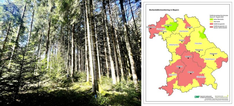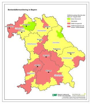 Bericht und Karte: Bayerisches Landwirtschaftsministerium – Foto: Hötzelsperger – Karte zur aktuellen Gefährdungslage für Befall durch Buchdrucker – weitere Informationen finden Interessierte online unter https://www.fovgis.bayern.de/borki/.