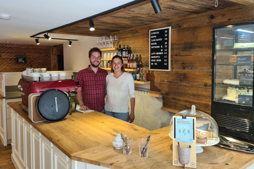 Bericht und Bilder: Bayerisches Landwirtschaftsministerium – 1. Foto zeigt das Café Handvollgrün in Missen im Allgäu von Franziska Rust (r.) und ihrem Mann Nikolas (Foto: Franziska Rust). Das 2. Projekt ist die Umwandlung eines ortsbildprägenden ehemaligen Vierseithofs im niederbayerischen Grafenau zur Physiopraxis (Fotos: Daniela Blöchinger).