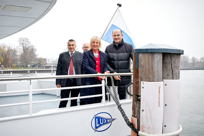Bericht und Foto: Bayerisches Sozialministerium – von links: Geschäftsführer der Bayerischen Schifffahrt Michael Grießer und Betriebsleiter Matthias Leis, Ehrenamtsministerin Ulrike Scharf und Finanz- und Heimatminister Albert Füracker