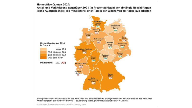 Nah am bundesweiten Mittel von 22,7 Prozent liegen die Länder Nordrhein-Westfalen und Schleswig-Holstein mit jeweils 22,9 Prozent sowie Bremen mit 22,3 Prozent. In Rheinland-Pfalz (20,8 Prozent), Niedersachsen (20,4 Prozent), Brandenburg (18,1 Prozent) und dem Saarland (17,3 Prozent) arbeiten die Beschäftigten etwas seltener von zu Hause aus. Die geringsten Homeoffice-Quoten haben Mecklenburg-Vorpommern (14,1 Prozent), Thüringen (13,5 Prozent) und Sachsen-Anhalt (10,9 Prozent).