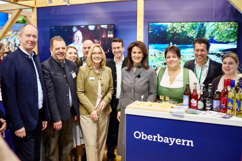 Bericht und Foto: Bayerisches Landwirtschaftsministerium / Foto: Henning Schacht – Tourismusministerin Michaela Kaniber gemeinsam mit Geschäftsführerin Barbara Radomski (5.v.l.) und weiteren Vertretern am Stand der BayTM GmbH in der Bayernhalle.