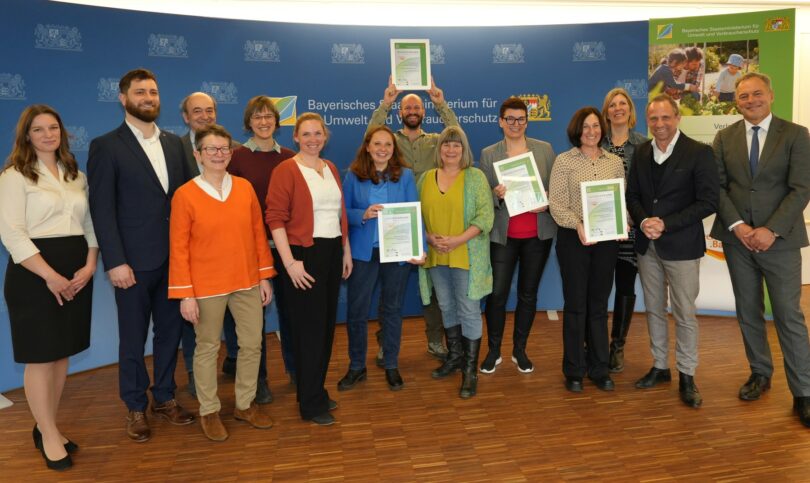 Bildbeschreibung: Umweltminister Thorsten Glauber und Ministerialdirektor Dr. Rüdiger Detsch mit den ausgezeichneten Trägern des Qualitätssiegels “Umweltbildung.Bayern”.