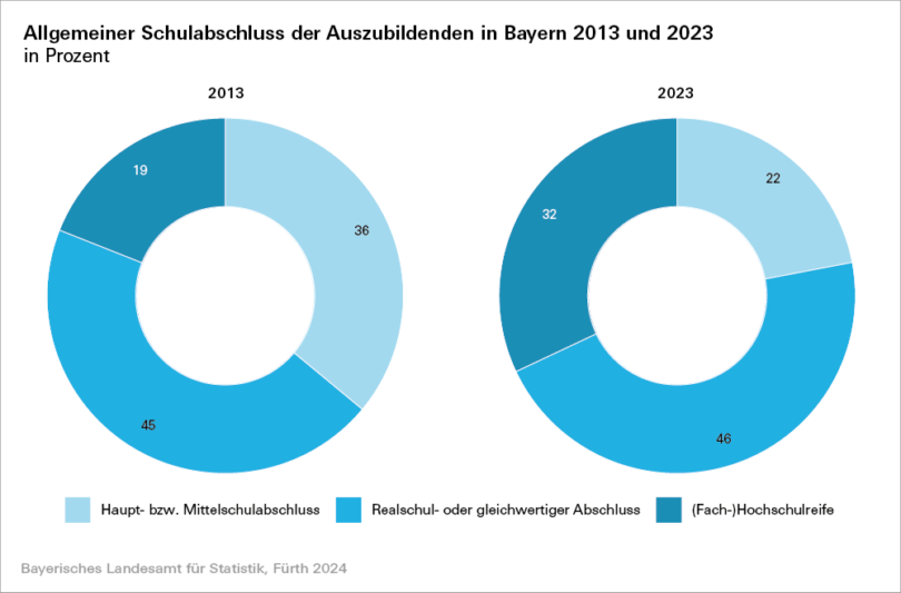 Bayernweit lässt sich ein Trend hin zu Auszubildenden mit vorherigem beruflichem Bildungsabschluss beobachten. Im Jahr 2023 verfügen 21 Prozent aller Auszubildenden über einen solchen Abschluss. Dabei hat die Hälfte von ihnen zuvor eine Lehre oder Berufsausbildung abgeschlossen, während 38 Prozent einen akademischen Abschluss innehaben. 2013 waren es noch 12 Prozent der Auszubildenden, die bereits einen beruflichen Bildungsabschluss erworben hatten, etwa drei Viertel davon mit einer Berufsausbildung.