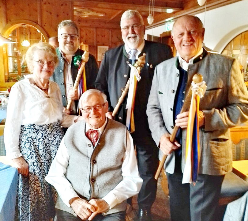 „An meinem 25. Geburtstag am 3. Mai 1958 war meine Hochzeit inmitten meiner Studentenzeit nachdem ich zuvor das Maler-Handwerk erlernte. Einen Hochzeitslader konnten wir uns damals nicht leisten, umso mehr freut es mich, dass heute aus den Reihen des Bayernbundes mit Landesvorsitzendem Sebastian Friesinger sowie mit den Kreisvorsitzenden Christian Glas und Norbert Zehrer drei gestandene Hochzeitslader da sind“ – so Konrad Breitrainer bei seiner Begrüßung. Das Hochzeitslader-Trio erfreute mit Verserln und Gstanzln, begleitet wurden sie auf der Zither von Hans Berger, der als Ehrenmitglied ebenso zugegen war wie die weiteren Ehrenmitglieder Elfriede Göppelhuber, Hans Glas, Konrad Gartmeier und Kurt Franz. Breitrainer war die treibende Kraft bei der Gründung des Kreisverbandes, dessen Vorsitzender er von 1994 bis 2008 war. Kreisvorsitzender Christian Glas dankte dem Jubilar in seiner Laudatio für dessen vorbildliche Heimatliebe und Bayernbund-Treue. Stellvertretender Kreisvorsitzender Sepp Höfer erinnerte an viele Projekte, Ausflüge und Vorträge, dazu ergänzte er: „Besonders in Erinnerung blieb mir ein Vortrag über den Islam, da waren auch Islamisten vor Ort und stimmten den Ausführungen von Konrad zu“.