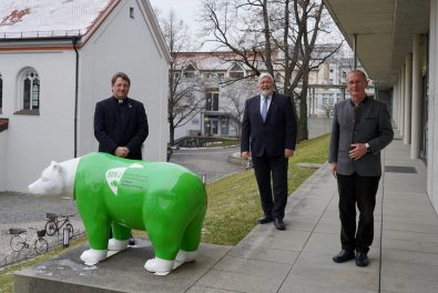 Fotos: Bayernbund –  Diözesanjugendpfarrer Richard Greul im Gespräch – Vor dem Münchener KorbiniansHaus: (v.l.) Domvikar Richard Greul, Landesvorsitzender Sebastian Friesinger, Redakteur Fritz Lutzenberger