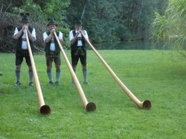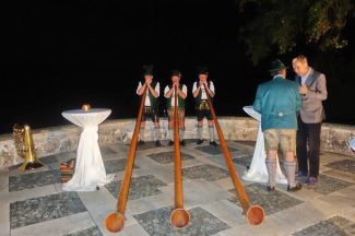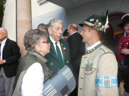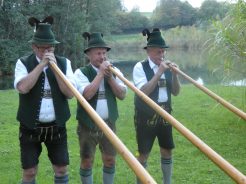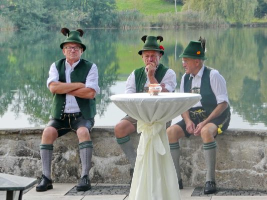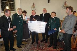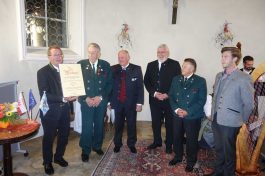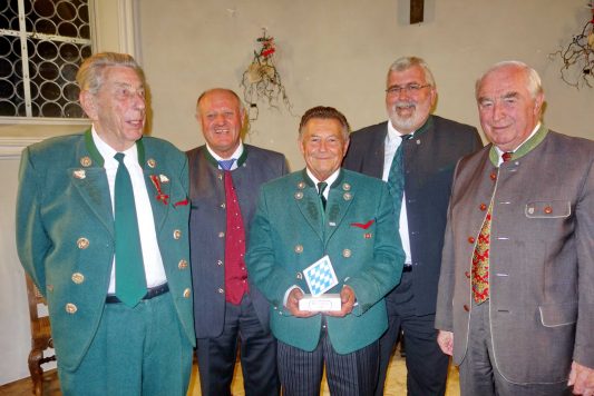 Der Haimat-Preis (die bairische Schreibweise wurde auf Anregung von Kreisverbands-Ehrenvorsitzenden Konrad Breitrainer angenommen) und nach einem Entwurf von Zweitem Kreisvorsitzenden Sepp Höfer aus Bad Feilnbach von Steinmetz Michael Finsterer aus Großholzhausen hergestellt, er zeigt eine hochgestellte bayerische Raute mit Rautenmuster. Die Verleihung erfolgte auf Entscheidung der Jury (Hans Berger, Roland Bräger, Oliver Döser, Otto Lederer, Christina Pfaffinger, Horst Rankl, Ferdinand Steinbacher, Klaus Stöttner, August Voit und Bayernbund Rosenheim) zugunsten des Vereins. Überreicht wurde der Preis an den kommissarischen Ersten Vorsitzenden Dieter Höpfner, seinen Vorgänger Hans Pumpfer sowie an die Nachwuchs-Ehrenamtlichen Florian Wittmann (Schriftführer) und Michael Vordermayer (Kassier). „Wir werden dem Preis alle Ehre machen“ – mit diesem Satz dankte Dieter Höpfner für die Auszeichnung und er versprach, den mit 1.000 Euro verbundenen Preis zugunsten der Friedens-Wallfahrt einzusetzen. Dieter Höpfners besonderer Dank galt Hans Pumpfer, den er als wunderbaren Menschen bezeichnete, der ebenso wie der weitere Sachranger Mitbürger und in Hartmannsberg anwesende Hansjörg Schellenberger vom Musik Forum Sachrang vor kurzem das Bundesverdienstkreuz erhielt. Der Preisverleihung folgte noch eine Einladung zum Stehempfang, dabei gab es kulinarische Genüsse dank des Entgegenkommens vom Kantinenwirt Bernard vom Landratsamt Rosenheim und der Brauereien Maxlrainer und Auerbräu. Für die musikalische Unterhaltung sorgten die von der Gemeinde Aschau entsandten Aschauer Alphornbläser mit Erich Gawlik, Anderl Pertl und Hans Bauer sowie Tobias Sporer mit Ziach und Sebastian Resch mit Bariton aus Oberaudorf. „Die Ölbergwallfahrt ist ein nachhaltiges, christliches Zeugnis für ein nachbarschaftliches Miteinander von Bayern und Tirol – und so möge es auch bleiben“ – so Laudator Sebastian Friesinger in seinen Ausführungen. Und der geehrte Verein mit Dieter Höpfner antwortete darauf: „Die Wallfahrt soll zeigen, dass wir ganz sicher Niemand ausgrenzen. Aber wir möchten auch nicht gezwungen werden, in einer anderen Werte-Ordnung zu leben, als in der, die wir auf der Basis unserer christlichen Werte empfinden und lieben“. Der Haimatpreis des Bayernbund-Kreisverbandes wird alle zwei Jahre verliehen. Die nächste öffentliche Veranstaltung des Bayernbundes ist am Sonntag, 28. Oktober ab 11 Uhr beim Gasthaus Vornberger in Altenbeuern ein volksmusikalischer Spaziergang zur Förderung von Kinderchören.