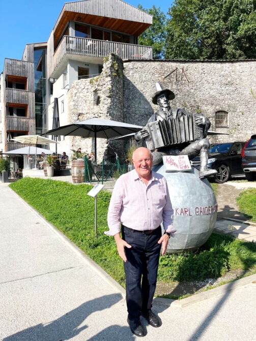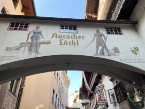 Am Marienbrunnen am unteren Startplatz begann der Rundgang mit Ausführungen der wechselvollen Geschichte der Stadt. Über 1.000 Jahre gehörte die Stadt zum Bayernland, genau vor 100 Jahren wurde von der Stadt Kufstein die Festung erworben. Der Inn, der die Stadt in zwei Teile trennt, hatte gleichfalls eine hohe Bedeutung für die Entwicklung der Stadt. Weiter ging es entlang des Inns zu einem Denkmal, dem Musiker Paul Ganzer, der das Lied „Die Perle Tirols“ komponierte. Nicht weit war dann der Weg in die berühmte Römergasse. Zwischen den zwei Altstadttoren in einer Länge von 100 m laden viele Geschäfte, Gastronomiebetriebe und Läden zum Bummeln und Einkehren ein. Die Häuser sind kunstvoll bemalt und mit Trinksprüchen und Weisheiten beschriftet.