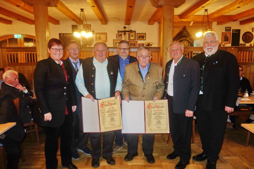 Der in Bayern mit derzeit 633 Mitgliedern stärkste Kreisverband hat zwei neue Ehrenmitglieder: Konrad Gartmeier und Hans Glas erhielten aus der Hand von Rosenheims Kreisvorsitzenden Christian Glas aufgrund ihres langjährigen Engagements das Ehrenzeichen mit großer Urkunde bei der Jahresversammlung im Gasthaus „Zur schönen Aussicht“ bei Wirt und Bayernbund-Mitglied Hans Gehrlein in Höslwang überreicht.
