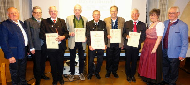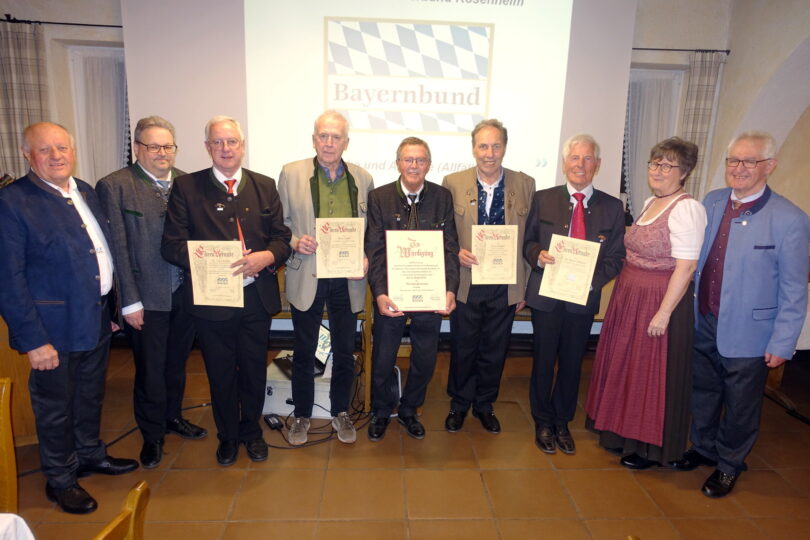 Die Ernennung des Gründungsmitglieds zum Ehrenmitglied war auch verbunden mit einem Dank für Höfers Organisationstalent und für seine Ratgeber-Fähigkeiten. Darüber hinaus gab es weitere Ehrungen. Mit dem Ehrenzeichen für besondere Verdienste wurden Gebirgsschütze Sepp Entfellner aus Bad Endorf, Albert Sanftl aus Rosenheim (Kassenprüfer und kirchliche Dienste) sowie Dr. Helmut Wittmann geehrt. Wittmanns Buch „Freude an der Mundart“ war und ist ein sehr nachhaltiges Projekt, denn damit sind in Bayern die Mundarten in allen Lehrplänen der allgemeinbildenden Schulen (Grundschule, Mittelschule, Realschule und Gymnasium) verankert. Zudem wurden die praktischen Ergebnisse vom Staatsinstitut für Frühpädagogik digitalisiert und sie dienen in den Schulen für andere Projekte wie für die vom Bayernbund unterstützten Mundartwege. Als Verbindungsmann zwischen Tirol und Bayern und als Vertreter der UNO in Wien hat Dr. Josef Siegele schon mehrfach wertvolle Dienste in der grenzüberschreitenden Zusammengehörigkeit geleistet, auch er bekam als treues und aktives Bayernbund-Mitglied das Ehrenzeichen, eine Urkunde und ein Chiemseer-Klosterladen-Präsent. Einen Blumenstrauß erhielt Schriftführerin Sabine Karl aus Neubeuern für ihre verlässlichen und ebenfalls ehrenamtlichen Dienste.