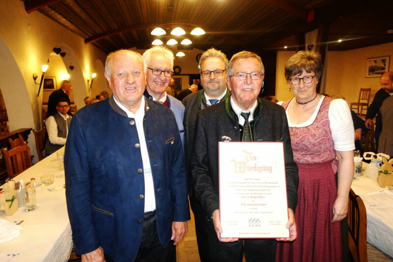 - Ehrung Sepp Höfer von links: Christian Glas, Manfred Karl, Norbert Zehrer, Ehrenmitglied Sepp Höfer, Sabine Karl.