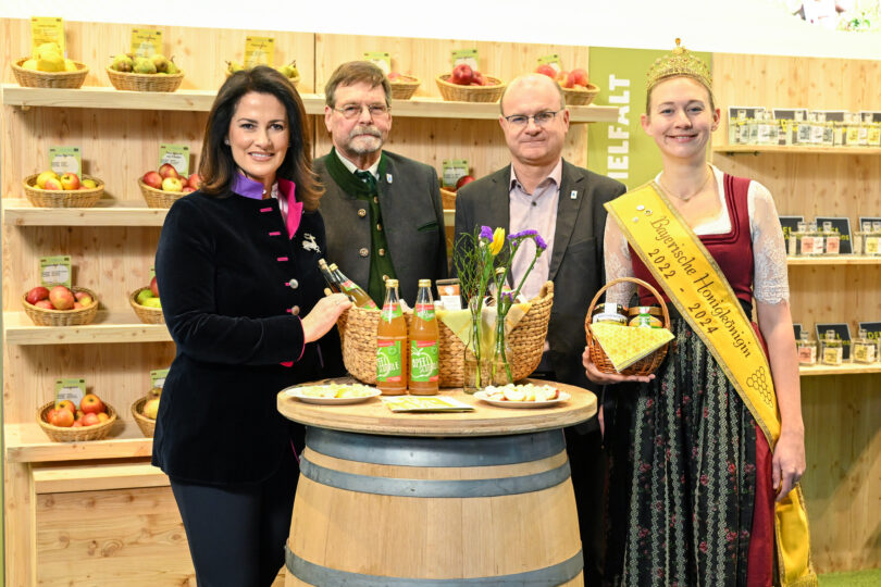Bericht: Bayerisches Landwirtschaftsministerium – Foto: Tobias Hase /StMELF v. l. n. r. Staatsministerin Michaela Kaniber, Wolfram Veitl, Präsident des Bayerischen Landesverbands für Gartenbau und Landespflege, Dr. Norbert Schäffer, erster Vorsitzender des Landesbunds für Vogel- und Naturschutz in Bayern und die amtierende bayerische Honigkönigin Victoria Seeburger auf der Streuobstsonderfläche in der Bayernhalle.