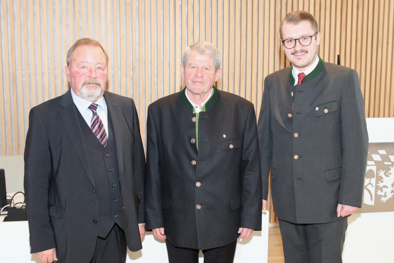Kurz vor Ende der laufenden Wahlperiode ist der Frasdorfer Helmut-Josef Freund (rechts) von der Bayernpartei in den Rosenheimer Kreistag nachgerückt. Er folgt seinem Vater Helmut Freund (Mitte) nach, der sein Kreistagsmandat nach 35 Jahren aus gesundheitlichen Gründen niederlegte. Nachdem die Mitglieder des Kreistages ihr Einverständnis erklärt hatten, nahm der stellvertretende Landrat Josef Huber (links) Helmut-Josef Freund den Amtseid auf das Grundgesetz der Bundesrepublik Deutschland und die Verfassung des Freistaats Bayern ab. Erster Nachrücker in der Liste der Bayernpartei wäre der Bad Aiblinger Florian Weber gewesen. Er hatte mitgeteilt, aus beruflichen Gründen das Mandat nicht annehmen zu können.