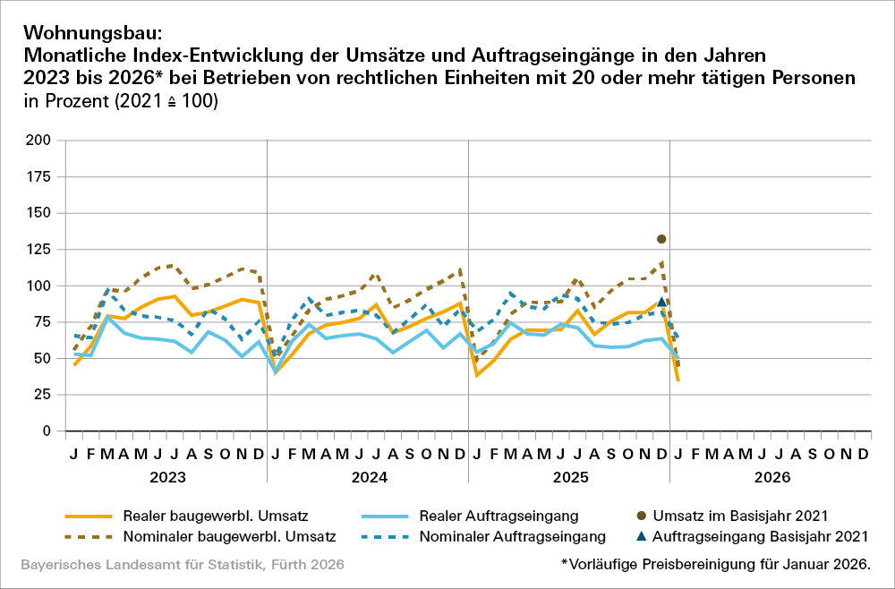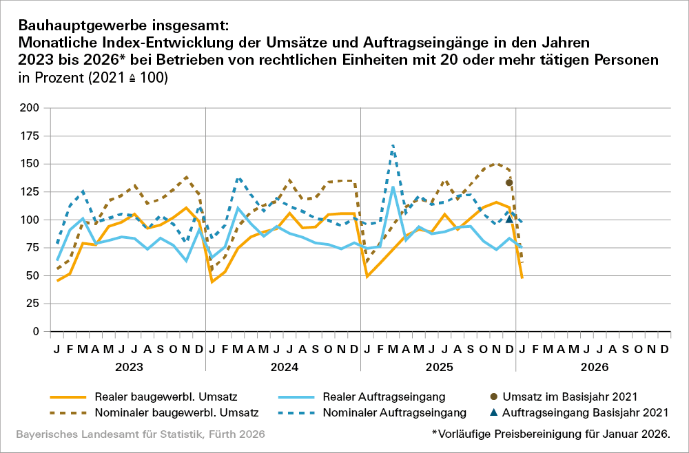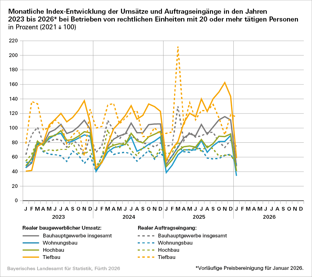 Die Auftragseingänge im bayerischen Bauhauptgewerbe steigen im Januar 2026 um 1,8 Prozent. Deutlich positiv entwickeln sich die Auftragsvergaben im Vorjahresvergleich in den beiden größten Bausparten des Tiefbaus: +39,8 Prozent im gewerblichen und industriellen Tiefbau und +16,0 Prozent im öffentlichen Tiefbau für Gebietskörperschaften und Sozialversicherungen. Im Hochbau verzeichnen dagegen alle Bausparten abnehmende Auftragsvergaben. Die Spanne der Rückgänge beläuft sich zwischen 7,0 Prozent im Wohnungsbau und 56,3 Prozent im öffentlichen Hochbau für Gebietskörperschaften und Sozialversicherungen.