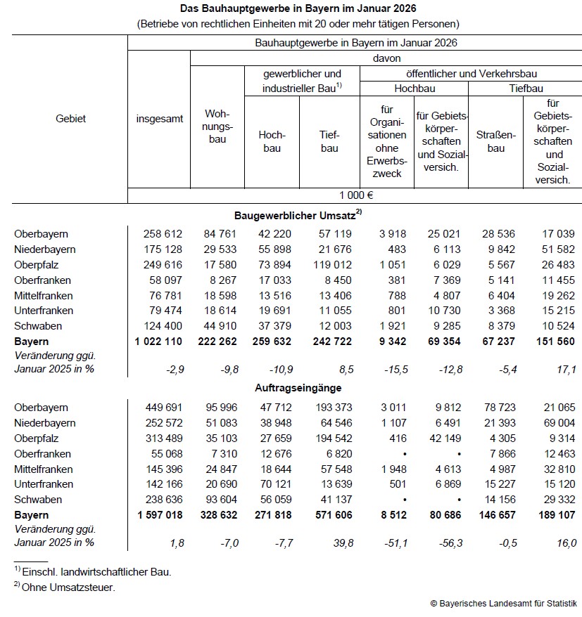 Im Januar 2026 erzielt das bayerische Bauhauptgewerbe einen baugewerblichen Umsatz von rund 1,02 Milliarden Euro. Im Tiefbau werden höhere Umsätze gegenüber dem Vorjahresmonat erwirtschaftet. Insbesondere gilt das für den öffentlichen Tiefbau für Gebietskörperschaften und Sozialversicherungen mit einem Plus von 17,1 Prozent. Auch die Auftragseingänge entwickeln sich im Tiefbau positiv. Mit einem Plus von 39,8 Prozent ist im gewerblichen und industriellen Tiefbau die größte Steigerung zu verzeichnen. Im Hochbau hingegen sind sowohl Umsatz als auch Auftragseingänge rückläufig.