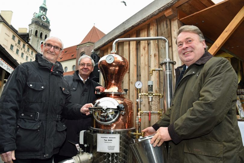 Unter dem Motto „Wir brennen für Bayern“ präsentieren Bayerns Edelbrenner derzeit auf dem Münchner Viktualienmarkt Hochprozentiges aus den Regionen des Freistaats. Noch bis zum Samstag können die Münchner Genießer und alle, die es werden wollen, zum 210. Jubiläum des Markts an vielen Ständen die verschiedensten hochwertigen Destillate probieren. Dazu gibt es wertvolle Informationen über die Herstellung. Wer tiefer in die Materie einsteigen will, kann auch eins der begleitenden Seminare in verschiedenen Münchner Traditionsgasthäusern besuchen. Landwirtschaftsminister Helmut Brunner (r.), der zusammen mit Kommunalreferent Axel Markwardt (l.) und Stadtrat Hans Podiuk die Veranstaltung am Mittwoch eröffnete, bezeichnete die heimischen Edelbrände als „Essenz unserer Regionen“. Die Verwendung der vielfältigsten Streuobstfrüchte leiste zudem einen aktiven Beitrag zum Naturschutz. „Edelbrände sind Kulturlandschaft in höchster Konzentration“, sagte der Minister. Brunner hatte vor zwei Jahren gemeinsam mit den drei Klein- und Obstbrennerverbänden der Regionen Franken, Lindau und Südostbayern die Initiative „Bayern Brand“ ins Leben gerufen, um das Bewusstsein der Verbraucher für die Spitzenprodukte der heimischen Edelbrenner zu schärfen und auch die Verwendung in der Gastronomie voranzubringen. Detaillierte Informationen zur Initiative und zur Aktion am Viktualienmarkt sind online unter www.bayern-brand.de zu finden.