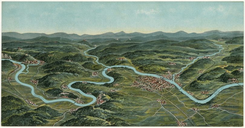 „Regensburg und Umgebung aus der Vogelschau“ Eugen Felle 1913 © Haus der Bayerischen Geschichte Der Allgäuer Maler Eugen Felle (1869–1934) schuf unglaublich detailgetreue und realistische Darstellungen bayerischer Städte und Landschaften aus der „Vogelschau“, die um die Jahrhundertwende als Bildpostkarten großen Absatz fanden. Im Vergleich mit einem Blick von oben heute zeigt sich, wie sich Bayern seit Ende des Zweiten Weltkriegs vom Agrar- zum Industrie- und Dienstleistungsstandort gewandelt und dabei sein Landschaftsbild massiv verändert hat.