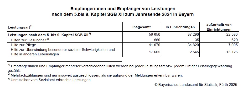 Wie das Bayerische Landesamt für Statistik mitteilt, erhalten zum Jahresende 2024 bayernweit 59 650 Personen Sozialhilfeleistungen in besonderen Lebenslagen nach dem 5. bis 9. Kapitel SGB XII. Dies entspricht im Vergleich zum Vorjahr einem Anstieg um 4,8 Prozent. Mehr als zwei Drittel erhalten dabei Hilfe zur Pflege. Zu 62,5 Prozent werden die Leistungen in Einrichtungen erbracht. Die Personen im Leistungsbezug sind mehrheitlich weiblich und häufig 65 Jahre alt oder älter.