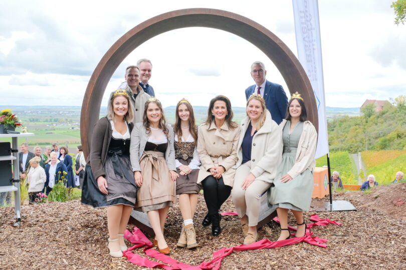 Bericht und Foto: Bayerisches Landwirtschaftsministerium / Pia Regnet/StMELF – Das Bild zeigt Staatsministerin Michaela Kaniber gemeinsam (1.Reihe, v.l.) drei Weinprinzessinnen der Region sowie Antonia Kraiß (Fränkische Weinkönigin, 5.v.l.), Lara Schönleben (Ipsheimer Weinkönigin, 6.v.l.) sowie (2. Reihe, v.l.) Landrat Christian von Dobschütz, Stefan Eber (Vorsitzender Weinbauverband Ipsheim e.V.) und Stefan Schmidt (1. BM Markt Ipsheim) am Ipsheimer Panoramablick.