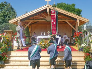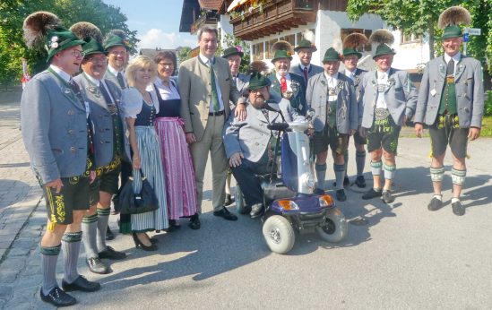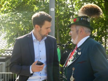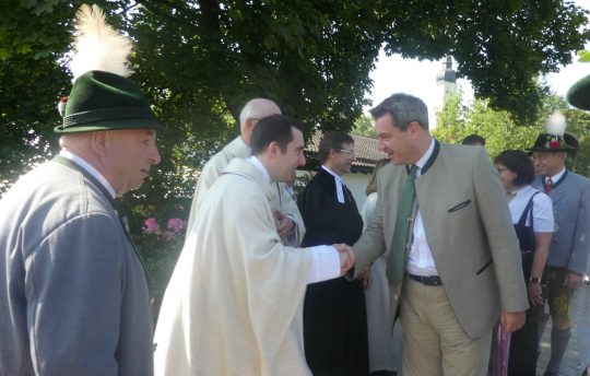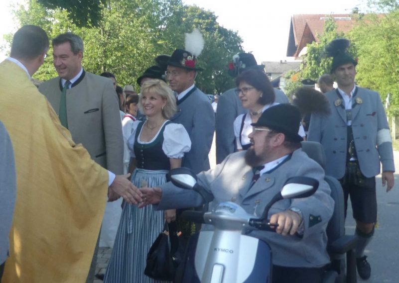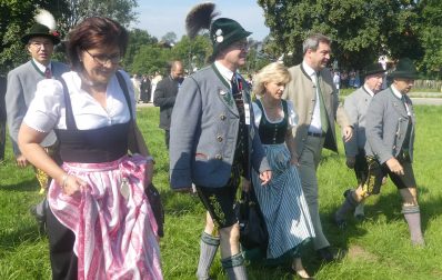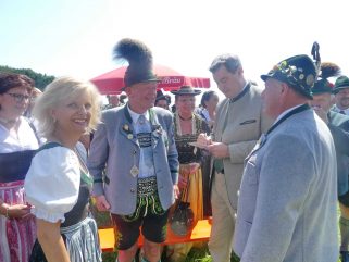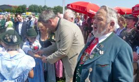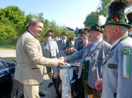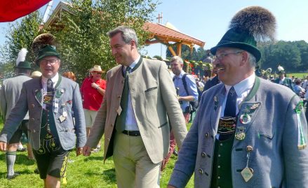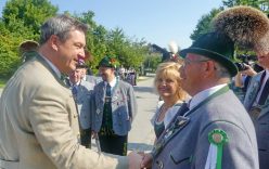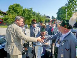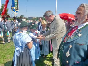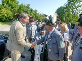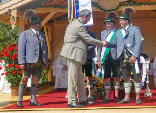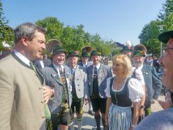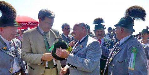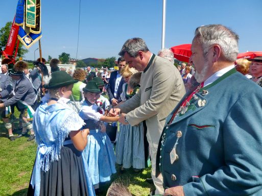 Die hohe Ehre, Bayerns Ministerpräsidenten Dr. Markus Söder als Ehrengast begrüßen zu dürfen, hatten der Gauverband I und der Trachtenverein “D´Simsseer” in Prutting als sie mit 8.000 aktiven Trachten- und Musikanten-Teilnehmern zu Bayerns größtem Trachtenfest in den Landkreis Rosenheim eingeladen hatten. „Bayern ist am schönsten!“ – mit diesem Satz begann der Ministerpräsident sein Grußwort angesichts des Blickes in die fast unüberschaubare Trachtlerschar und er sagte weiter: „In Zeiten der Veränderungen, Globalisierungen und Gleichmacherei ist die Tracht kein Relikt aus der alten Zeit, sondern ein Symbol für Bodenständigkeit und Heimatliebe. Ihr leistet eine großartige Arbeit, deswegen verstehe ich den Appell Eures Gauvorstands Peter Eicher, der in seiner Begrüßung forderte, das Ehrenamt nicht mit Richtlinien und Verordnungen zu überfordern“. Konkret auf den Appell von Peter Eicher, der noch anmerkte, dass jede finanzielle Unterstützung für die Jugend die Sparkasse von morgen ist, sagte Ministerpräsident Söder noch: „Ein starker Staat braucht Sicherheit, aber wenn es um das Ehrenamt geht, brauchen wir einen freiheitlichen Staat. Bayern ist ein Lebensgefühl, das nicht seelenlos ist, Bayern ist wirtschaftlich erfolgreich und Bayern kann Innovation und Tradition gut verknüpfen, so dass wir auch weiterhin modern sein und bayerisch bleiben können“. Als Zeichen der Verbundenheit und zur Erinnerung an das heurige Jubiläum „100 Jahre Freistaat Bayern“ überreichte Markus Söder an den Pruttinger Festverein ein Fahnenband. Anschließend nahm er in der Festkutsche von Hans Riepertinger aus Hörzing zusammen mit Vorstand Ludwig Redl, Bürgermeister Hans Loy und Landtagsabgeordneten Klaus Stöttner (aus Prutting) am Festzug teil und grüßte abschließend auf der Ehrentribüne alle vorbeiziehenden Fahnenabordnungen und Musikkapellen sowie die vielen Ortsvereine von Prutting und die 118 Trachtenvereine des Gauverbandes I.