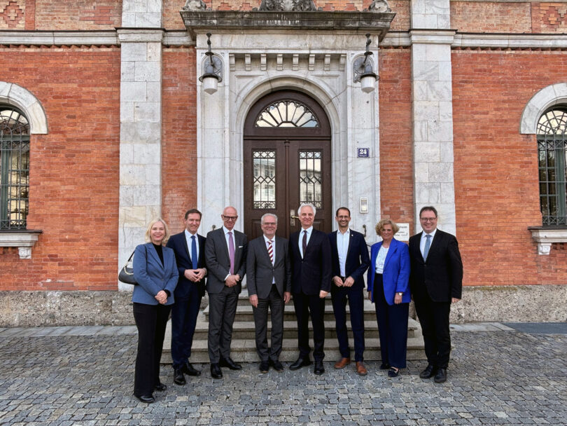 Bericht und Foto: Regierung von Oberbayern  – Regierungspräsidentinnen und ‑präsidenten vor dem Rathaus der Stadt Rosenheim (v.l.n.r.): Dr. Susanne Weizendörfer (Unterfranken), Rainer Haselbeck (Niederbayern), Walter Jonas (Oberpfalz), Dr. Erwin Lohner (Amtschef des Bayerischen Innenministeriums), Dr. Konrad Schober (Oberbayern), Oberbürgermeister Andreas März, Barbara Schretter (Schwaben), Florian Luderschmid (Oberfranken); es fehlen: Dr. Kerstin Engelhard-Blum (Mittelfranken), Landrat Otto Lederer, Bezirkstagspräsident Thomas Schwarzenberger
