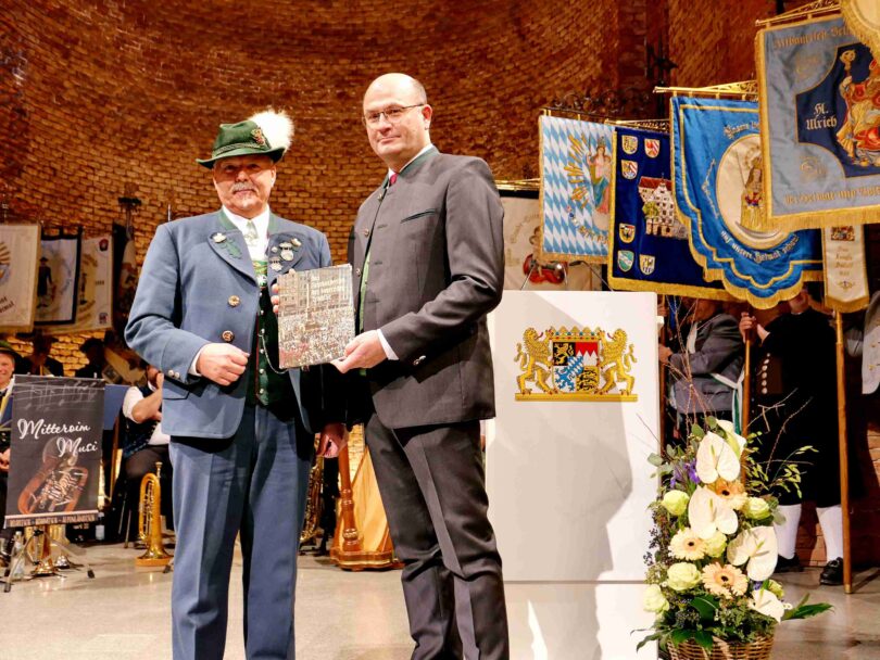 Archiv-Foto: Hötzelsperger – Staatsempfang 2023 – Landesvorsitzender Günter Frey bedankt sich bei Minister Füracker mit einem Bildband zum 100jährigen Bestehen des Trachtenverbandes 1983 mit Fest in München