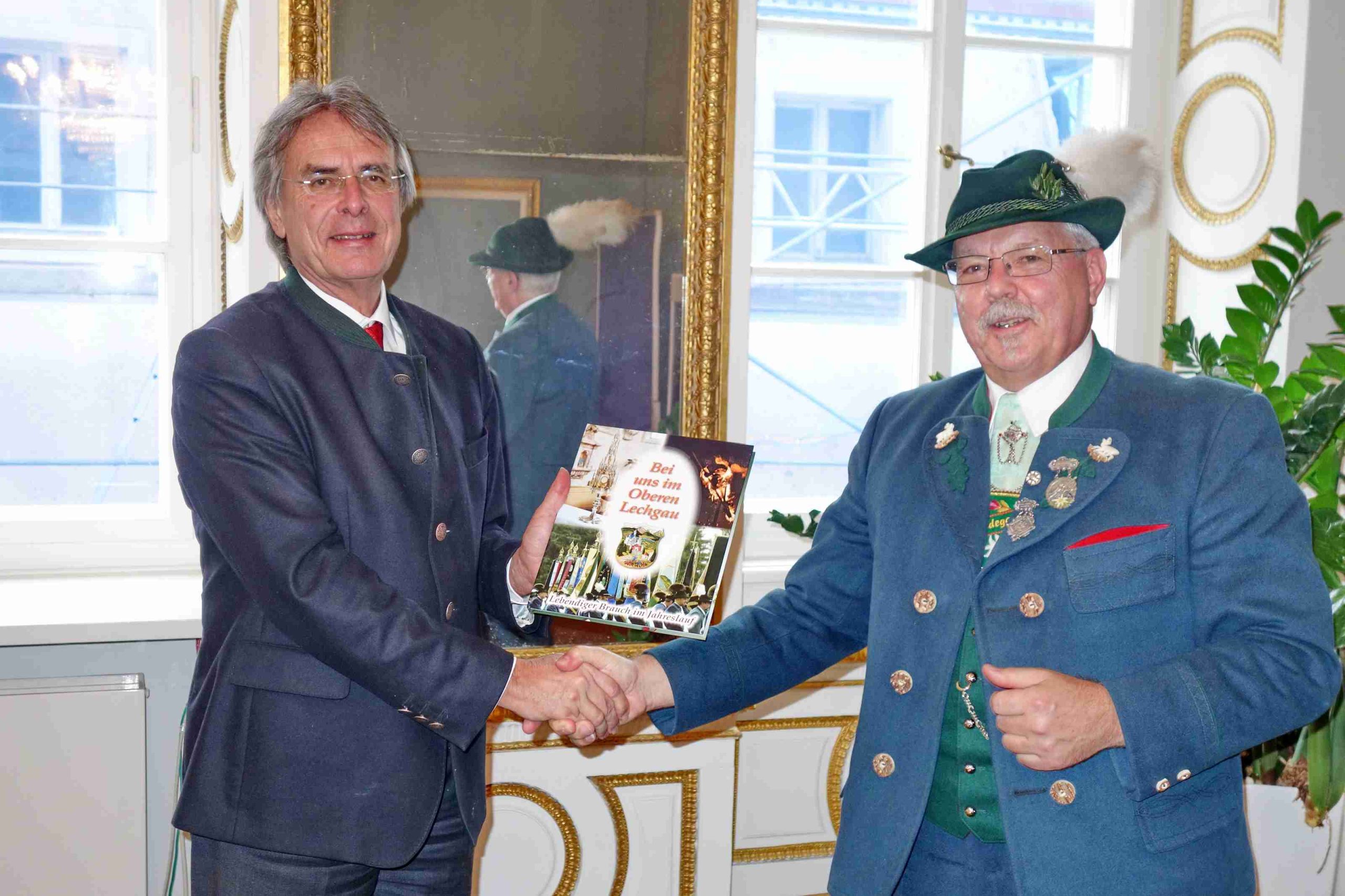 Trachtler-Landesvorsitzender Günter Frey (re.) bedankte sich beim Oberpfälzer Regierungspräsidenten Axel Bartelt mit dem Buch „Bei uns im Oberen Lechgau“.