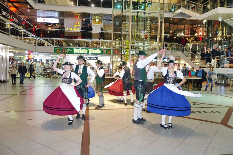 Parallel zur Internationalen Grünen Woche auf dem Berliner Messegelände findet im Europa-Center nahe Kudamm und Bahnhof Zoo eine Bayernwoche statt. Dabei treten noch bis Sonntag, 26. Januar die aus Bayern angereisten Musik-, Goaßlschnalzer- und Trachtengruppen im Rahmen ihrer Stadtrundfahrten oder nach ihrem Messeauftritt zustätzlich auf. Unsere ersten Aufnahmen zeigen die Isargau-Gaugruppe bei ihren Darbietungen im Europa-Center. Nach den Auftritten geht es noch zur gemütlichen und zum Teil auch musikalisch umrahmten Einkehr im Restaurant Kartoffelkiste im ersten Stock des Europa-Centers.