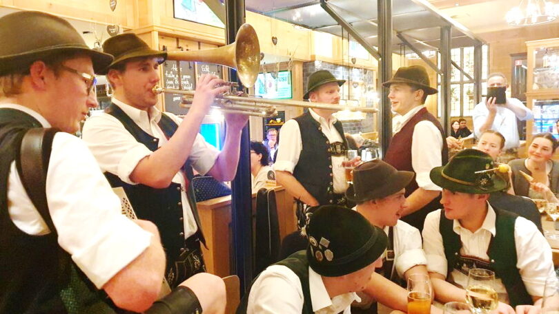 Es ist schon Tradition, dass man sich zum Abschluss der Grünen Woche zu einem gemütlichen Kehraus bei Maximilians, einem der renommiertesten Bayern-Wirtshäuser im Zentrum Berlins, trifft. Dieses Jahr hat sich die Gaugruppe vom Inngau Trachtenverband gleich nach ihren Auftritten in der Bayernhalle auf den Weg in die Berliner City gemacht. Aufgespielt haben die Anzwies Musi aus Atzing und die Brandseck Musi, die ebenfalls zuvor auf der Messe waren. Dazu gab es Alphorn-Einlagen vom Vorsitzenden des Vereins der Bayern in Berlin.