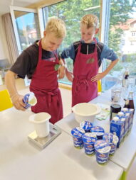 Pünktlich zur ersten Pause konnte Schulleiter Christoph Ascher die Bar eröffnen, bevor die Schüler*innen die Bar stürmten. „Lecker – darf ich nochmal etwas kosten?“ hörte man es rund um die beiden Milchbars bis die Pause zu Ende und die Milchbar abgeräumt war. Anschließend gab es für die 8. und 9. Klässler noch eine kleine Theorieeinheit zum Thema. Maria Riepertinger erklärte, warum Milch so wichtig für unsere Gesunderhaltung ist, und warum ein Milchersatzprodukt in Sachen Klimabilanz und Nährstoffdichte nie an echte Milch rankommt. Am Schluss waren sich alle Beteiligten einig: „Ein sehr gelungener Vormittag und ein wichtiges Projekt, das uns allen sehr viel Spaß gemacht hat“.