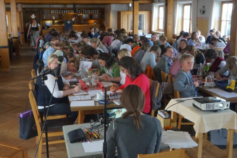 Am Nachmittag war Kreativität gefragt: beim Einstieg in das Handlettering mit Simone Saugspier wurden die Stifte ausgepackt und Papier bereitgelegt. Mit einer ausgetüftelten Technik machte die Kommunikationsdesignerin möglich, dass auch die Teilnehmerinnen ganz hinten im Saal sehen konnten, was sie auf ihr Papier brachte.