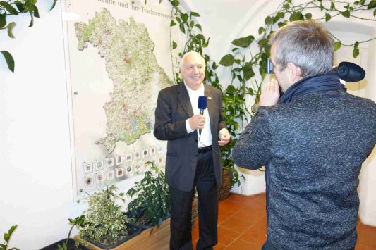 Fotos: Hötzelsperger – 1. Von links Ehrenvorsitzender Max Bertl, Landesschriftführerin Hildegard Hoffmann, William Hetzler und Landesvorsitzender Günter Frey mit Werken von Nikolaus Hipp und Rudolf L. Reiter. 2. Betrachtungen der Kunstwerke im Trachtenkulturzentrum Holzhausen. 3. Ehrenvorsitzender Max Bertl und William Hetzler. 4. Landesvorsitzender Günter Frey bedankt sich mit dem Buch „Trachtenlandschaft Bayern“ bei William Hetzler.