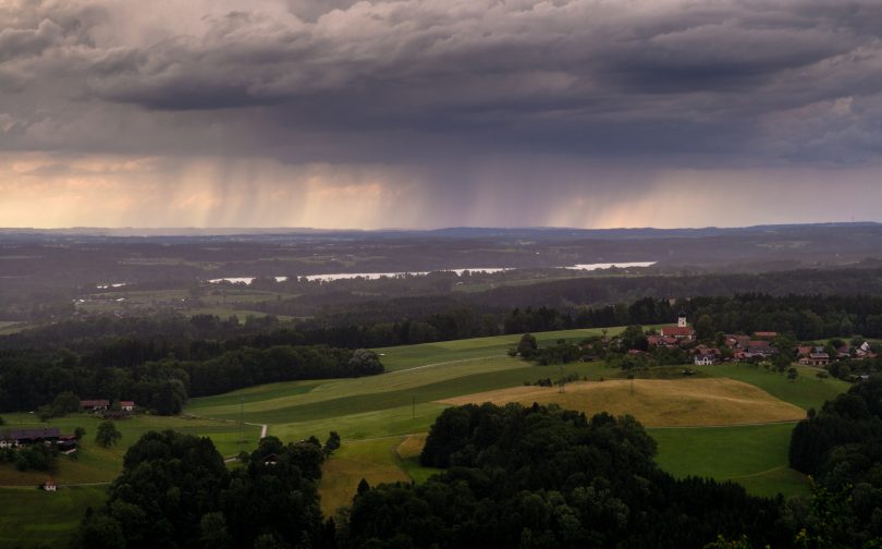 Selten ist die Grenze von Regenwolken so gut zu sehen wie auf diesem Foto, das beim Blick vom Samerberg hinaus ins Rosenheimer Land den Simssee und rechts den Ort Höhenmoos zeigt. Die sich auf das golden-grün gefärbten Wiesen und Wälder entleerenden Wolken machen sichtbar und deutlich, dass die Chiemgauer Landschaft nicht so schön wäre, würde es nicht auch mal regnen.