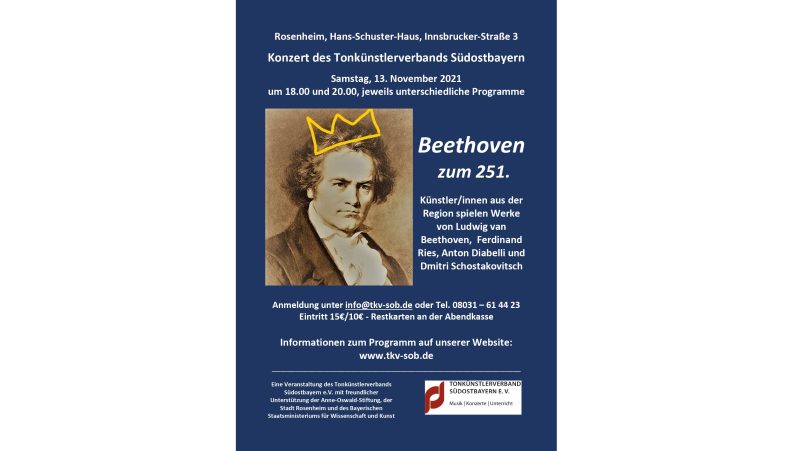 So hatten sich viele ihre Geburtstagsfeier nicht vorgestellt…Auch Beethovens 250. musste anders begangen werden als vielerorts geplant – oder gleich ganz ausfallen. Mit einem Jahr Verspätung und zwei Kammerkonzerten setzt der Tonkünstlerverband Südostbayern dem Vollender der Wiener Klassik und politischen Visionär die symbolische Krone auf. Am Samstag, 13. November konzertieren in der Region bestens bekannte Mitglieder des Tonkünstlerverbandes Südostbayern im Rosenheimer Hans-Schuster-Haus, Innsbruckerstraße 3. Zu hören sind zwei unterschiedliche und spannende Programme, um 18.00 sowie um 20.00, moderiert vom Komponisten und Kritiker Walther Prokop.