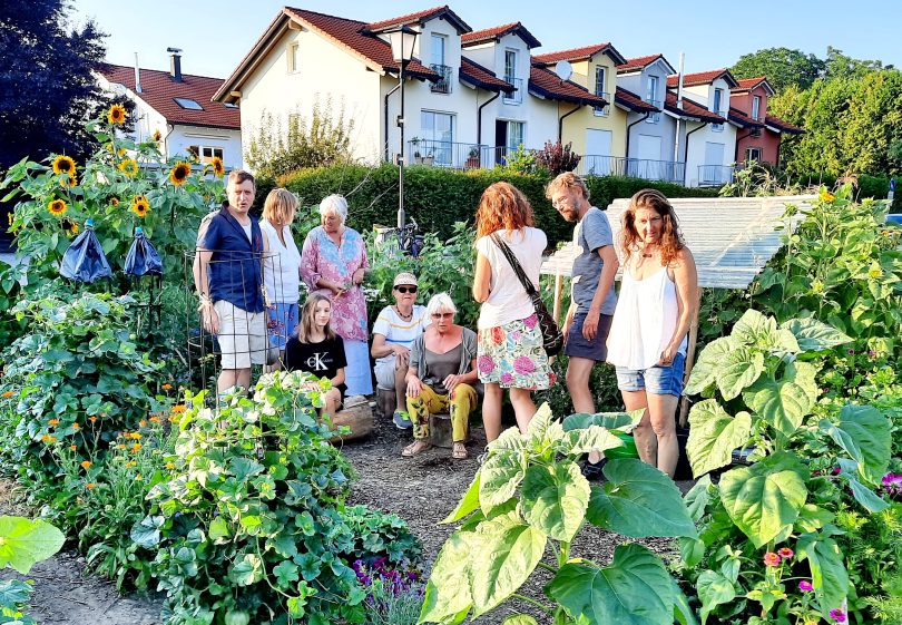 Ein Priener Gemeinschaftsprojekt – Sonnenblumen umrahmen ein üppig grünes Feld, aus dem einige Bohnenstangen ragen. In den einzeln abgeteilten Beeten gedeihen Kohl, Rüben, Zucchini, Gurken, alle Sorten Salat und Blumen. Ein großer, fruchtbarer Garten.