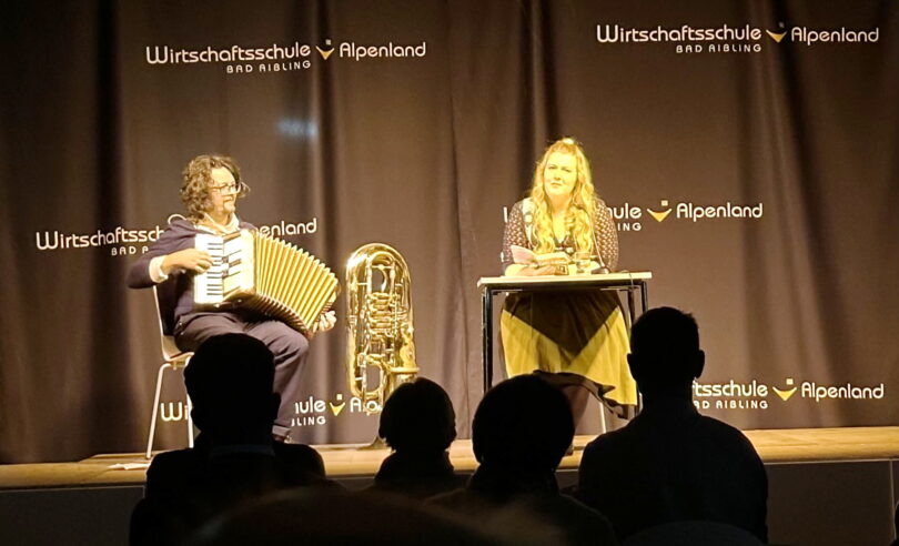 Die aus Simbach am Inn stammende Kabarettistin, Autorin und Schauspielerin Franziska Wanninger konnte an ihrem Erfolg bei einem Auftritt an der Wirtschaftsschule Alpenland vor sechs Jahren anschließen. Auch diesmal fand die Veranstaltung im Rahmen der Bad Aiblinger Literaturtage in der Aula der Schule statt. Für die Lesung aus ihrem satirischen Buch „Der famose Freistaat – Bayern verstehen für Anfänger und Fortgeschrittene“, das sie zusammen mit dem Kabarettisten und Schauspieler Martin Frank verfasst hat und das mehrere Wochen auf der SPIEGEL-Bestsellerliste stand, hatte sie den Komponisten und Bühnenmusiker Florian Burgmayr mitgebracht.