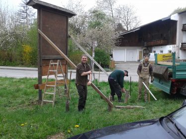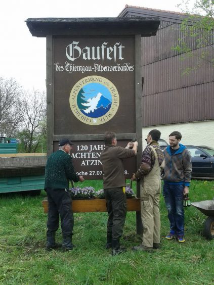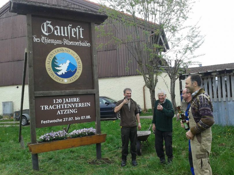 Mit viel Vorfreude auf kommende Trachtler-Festlichkeiten wurden an den Ortseingängen von Bachham die Begrüßungstafeln aufgestellt, die auf das Gautrachtenfest des Chiemgau-Alpenverbandes vom 27. Juli bis 7. August beim Trachtenverein „Daxenwinkler“ Atzing hinweisen. Knapp 100 Tage sind es noch, bis der Bieranstich mit der Festmusikkapelle Wildenwart erfolgt. Näheres zum Festprogramm gibt es auf der Seite www.gaufest.bayern.