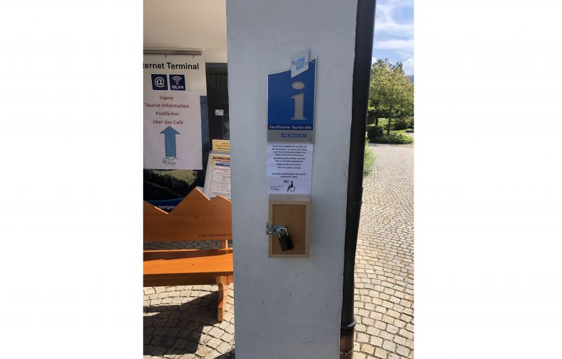 Neues gibt es in der TI Bergen. Ab sofort können Menschen mit Behinderung rund um die Uhr die Behindertentoilette in der Tourist-Information aufsuchen. Das Vorhängeschloss an dem Kasten lässt sich mit einem genormten Behindertenschlüssel öffnen. In dem Kasten befindet sich ein Chip, mit dem die Eingangstüren der TI geöffnet werden können, die ebenerdige Behindertentoilette ist dann bequem erreichbar. Diese Maßnahme wird auch in der chiemgauweiten Aktion „Best of Handbike“ guten Nutzen bringen. Bei dieser Aktion werden spezielle Radwege für Handbikefahrer ausgewiesen. Handbikes sind Fahrräder, mit denen Menschen mit Behinderungen sich fortbewegen können.