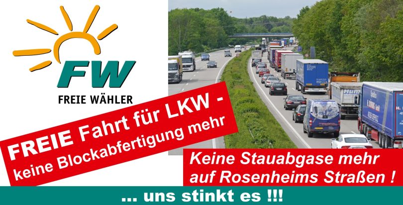 Anders als Grünen Fraktionschef Ludwig Hartmann beim Pressetermin vergangenen Montag, zeigen nämlich die FREIEN WÄHLER und die Bewohner des Inntals keinerlei Verständnis für die schikanöse Blockabfertigung! Diese ändert nichts an den Tatsachen, sondern erzeugt nur noch ohne Not mehr Abgase und Auffahrunfälle.