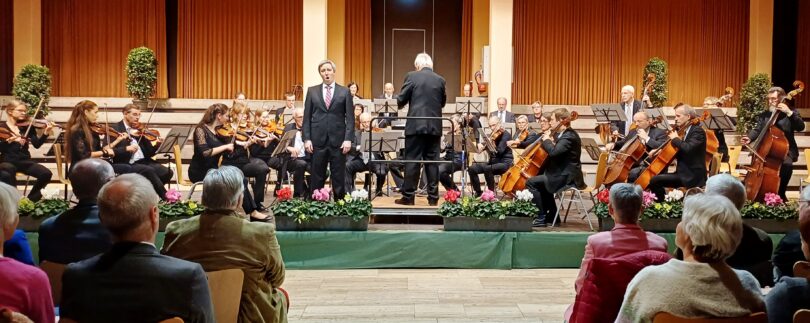Bericht und Fotos: Christiane Giesen – Das Musikkollegium Traunstein unter der Leitung von Augustin Spiel, hier mit dem lyrischen Bariton, Benjamin Sattlecker in der voll besetzten Aula der Berufsschule.