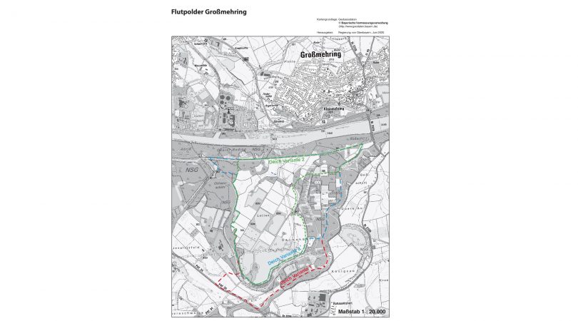 Das Raumordnungsverfahren für einen gesteuerten Flutpolder im Süden der Gemeinde Großmehring zum Hochwasserrückhalt und zur gezielten Absenkung von Hochwasserspitzen ist abgeschlossen. Als höhere Landesplanungsbehörde hat die Regierung von Oberbayern unter Berücksichtigung mehrerer Maßgaben insbesondere zum Natur- und Artenschutz, zum Schutz des Grund- und Oberflächenwassers sowie zum Schutz landwirtschaftlicher Belange die Raumverträglichkeit für die Variante 3 festgestellt. Sie umfasst eine Rückhaltefläche von 348 Hektar. Diese Variante wird den Herausforderungen des Klimawandels und einer nachhaltigen Raumentwicklung gerecht und vermeidet darüber hinaus besonders schwere Beeinträchtigungen der Belange von Land- und Forstwirtschaft, Naturschutz und Siedlung. Die Variante 1 mit einer Flächeninanspruchnahme von 433 Hektar sowie die Variante 2 mit 264 Hektar entsprechen demgegenüber nicht den Erfordernissen der Raumordnung.