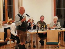 Im herbstlich geschmückten Saal im Atzinger Vereinshaus fand am 4. Oktober ein ganz besonderer Abend statt. Zunächst begrüßte der Ehrenvorstand des Fördervereins Peter Wendl die Akteure: die Liedertafel Prien, Leitung Willi Weitzel, den Krautinsel-Viergsang, Anita Amann und Willi Weitzel als Zither-Duo und die Priener Verserlschreiber mit deren Nestor Ernst Reiter sowie alle Gäste. Er wies darauf hin, dass die Spenden des Abends für den Einbau eines Aufzugs vom Keller zum Saal verwendet werden sollen.