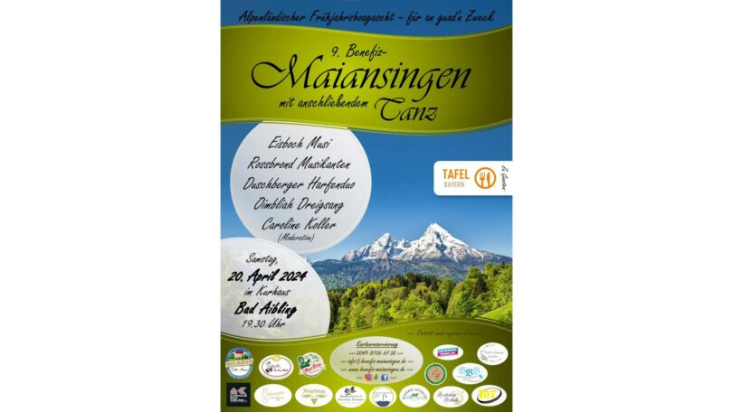 Am Samstag, den 20. April 2024, ist es wieder so weit: bereits zum 9. Mal findet das Benefiz-Maiansingen mit anschließendem Tanz im Kurhaus Bad Aibling statt.