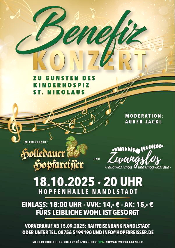 Zu einem Benefizkonzert zugunsten des Kinderhospiz St. Nikolaus wird am Samstag, 18. Oktober ab 20 Uhr in die Hopfenhalle nach Nandlstadt eingeladen.