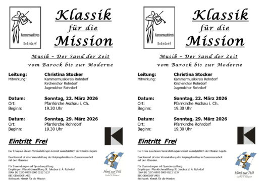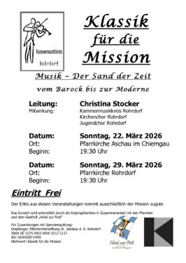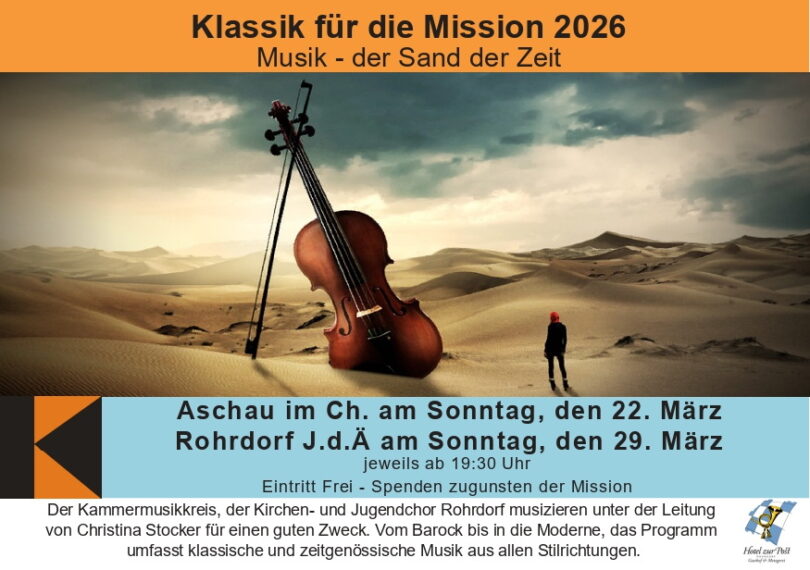 Klassik für die Mission – Musik – Der Sand der Zeit – Benefizkonzerte des Kammermusikkreises Rohrdorf in den Pfarrkirchen von Aschau (22.03.2026) und Rohrdorf (29.03.2026) – Neuauflage von „Klassik für die Mission“ in 2026.