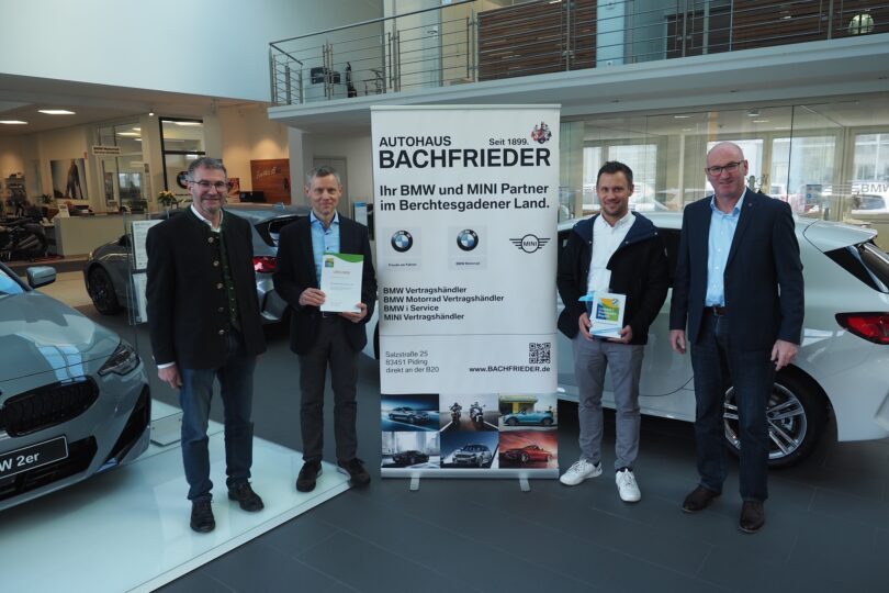 Für besonderes Engagement in Sachen Umwelt- und Klimaschutz würdigte Landrat Bernhard Kern erneut ein Unternehmen im Berchtesgadener Land. Das Autohaus Bachfrieder in Piding ist mit der Urkunde „Teilnehmer am Umwelt- und Klimapakt Bayern“ des Bayerischen Staatsministeriums für Umwelt und Verbraucherschutz ausgezeichnet worden.