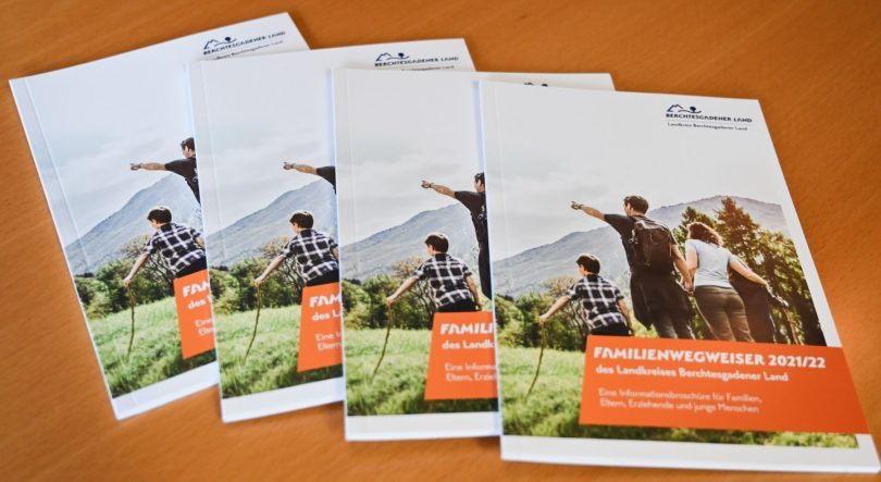 Bildunterschrift: Der neue Familienwegweiser 2021/2022 liegt bei allen Rathäusern der Gemeinden im Landkreis sowie im Landratsamt Berchtesgadener Land kostenlos aus.