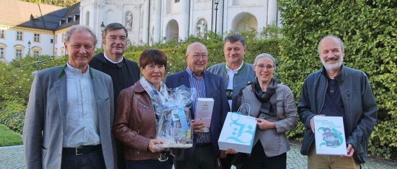 Foto: Am 28.09.2018 wurden Gisela und Wolfgang Schirrmann aus Konstanz als 100.000ste Besucher der Bayerischen Landesausstellung 2018 begrüßt. Auf dem Foto sind zu sehen (v.l.n.r.): Forstbetriebsleiter Nikolaus Stöger, Cellerar Pater Johannes Bauer OSB, Gisela und Wolfgang Schirrmann, Landrat Anton Speer, Projektleiterin Dr. Margot Hamm und Forstdirektor Dr. Stephan Gampe.