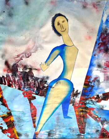Die Künstlerin fasst ihre Wahrnehmungen und Eindrücke der Menschen und ihrer Umgebung oft in annähernd gegenständlichen, aber farblich verfremdeten Bildern, aber auch abstrakten Kompositionen, bei denen die aussagekräftigen Titel wie „Feuersturm“, „Maske“ oder „Fächer“ Ansätze zur Interpretation geben mögen. Gleich am Eingang fällt das großformatige Bild „Durchbruch“ in Acryl-Mischtechnik ins Auge – eine anscheinend tanzende Frau, die sich, halb dem Betrachter zugewandt, offensichtlich glücklich von einer Sphäre in eine neue bewegt. Die erhobene Hand mit gespreizten Fingern scheint zu sagen „aufhalten könnt ihr mich nicht“. Ein ähnliches Lieblingsmotiv der Künstlerin ist das Bild „Wohin“ in mehreren Versionen. Eine aufrechte Frauengestalt von hinten mit großer Umhängetasche, jeweils in anderen Farben gehalten, bewegt sich selbstbewusst durch eine Art Türe, anscheinend in ein neues Leben.
