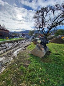 Von unterhalb der Kirche bis zum Kindergarten reicht der erste Bauabschnitt. Tonnenschwere Steine türmen sich am Rand des Obstangers auf, ein Bagger wartet auf den nächsten Einsatz, zwei riesige Baggerschaufeln liegen im Gras. Der Bach führt kaum Wasser. Es hat zu wenig geregnet in den vergangenen Wochen. Das übriggebliebene, kleine Rinnsal pumpt eine Pumpe nahe der Kirche in einen langen Schlauch. Ein Stück weiter flussabwärts läuft das Wasser wieder heraus, zurück in den Bergener Bach. So können die Arbeiter ohne nass zu werden, auf rund 100 Metern Länge die alten, morschen Holzbretter aus dem Gewässerbett ausbauen und den Grund mit Nagelfluh auslegen. Wasserbausteine verstärken bereits auf beiden Seiten einen Teil der Uferböschungen, damit sie bei Hochwasser nicht ausgespült werden. Doch es geht nicht nur um Hochwasserschutz.