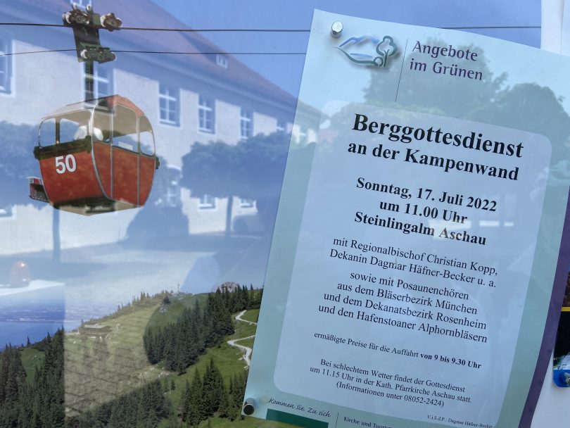 Am Sonntag, 17. Juli findet auf der Kampenwand wieder ein Berggottesdienst im Rahmen der Reihe “Angeobte im Grünen” statt. Beginn ist um 11 Uhr, bei ungünstigem Wetter ist der Gottesdienst um 11.15 Uhr in Aschau i. Chiemgau. Näheres siehe Plakat.